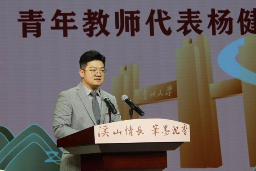 青年教师代表杨健晟说:“你们扎根三尺讲台,为贵州大地培养了无数优秀学子;你们潜心治学,为学术发展书写了浓墨重彩的篇章;你们言传身教,将贵大‘明德至善 博学笃行’的校训化作鲜活的榜样,激励着无数学子与后来者。我们青年教师将以你们为榜样,为学生点亮求知的明灯,为贵州发展贡献社会的力量,让贵大的未来更加辉煌。”