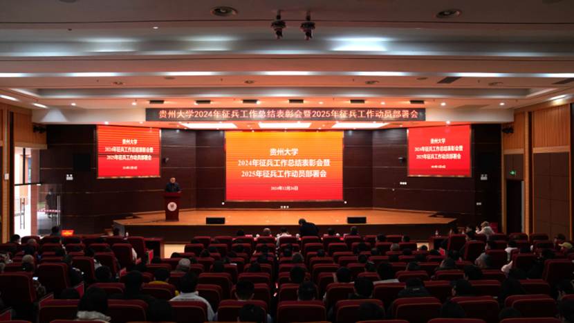 12月26日下午,贵州大学2024年征兵工作总结表彰会暨2025年征兵工作动员部署会在西校区贤正楼107报告厅举行。中国工程院院士、校长宋宝安,校党委副书记张洁,校纪委书记唐本文,副校长吴攀、王锦荣、王旭出席。征兵工作领导小组成员单位主要负责人、学院主要负责人及负责征兵工作老师、有意愿入伍学生代表参加会议。会议由党委学生工作部、武装部部长龙汶主持。