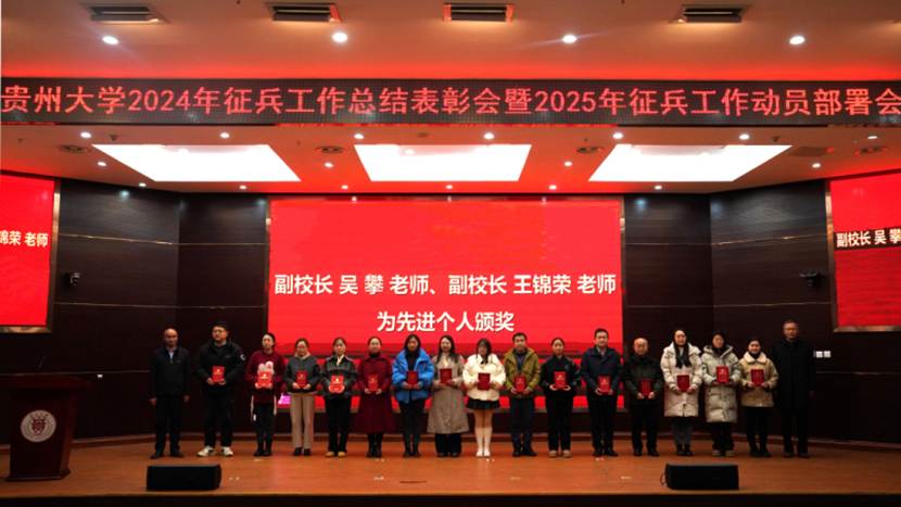 王旭宣读了贵州大学2024年征兵工作先进单位和先进个人表彰决定。校领导唐本文、吴攀、王锦荣分别为获奖单位和个人颁奖。