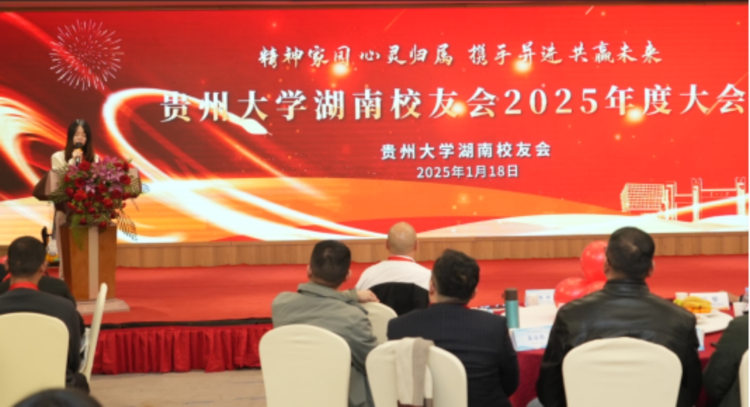 “精神家园、心灵归宿、携手并进、共赢未来”,1月18日,贵州大学湖南校友会成立大会暨2025年度大会在湖南湘潭召开。贵州大学党委常委、副校长吴攀,贵州大学材料与冶金学院党委书记刘剑,化学与化工学院党委书记杨静,对外合作处副处长黄剑,机械工程学院副教授、机械工程学院校友分会秘书长蔡家斌,化学与化工学院副教授付成兵,对外合作处校友联络科科长杨迤然,以及来自湖南长沙、株洲、湘潭、娄底、邵阳、怀化、岳阳、衡阳、永州、张家界等各地市州80余名校友代表出席大会,共话母校情缘,共叙师生情谊,共襄未来发展。