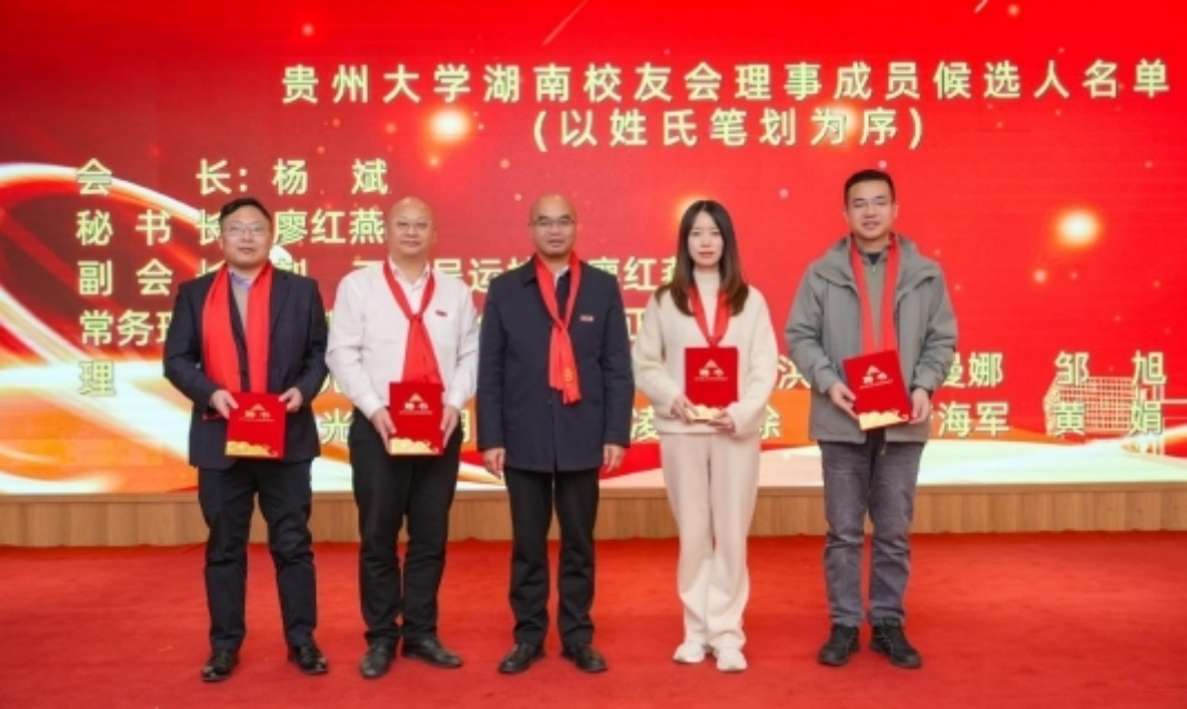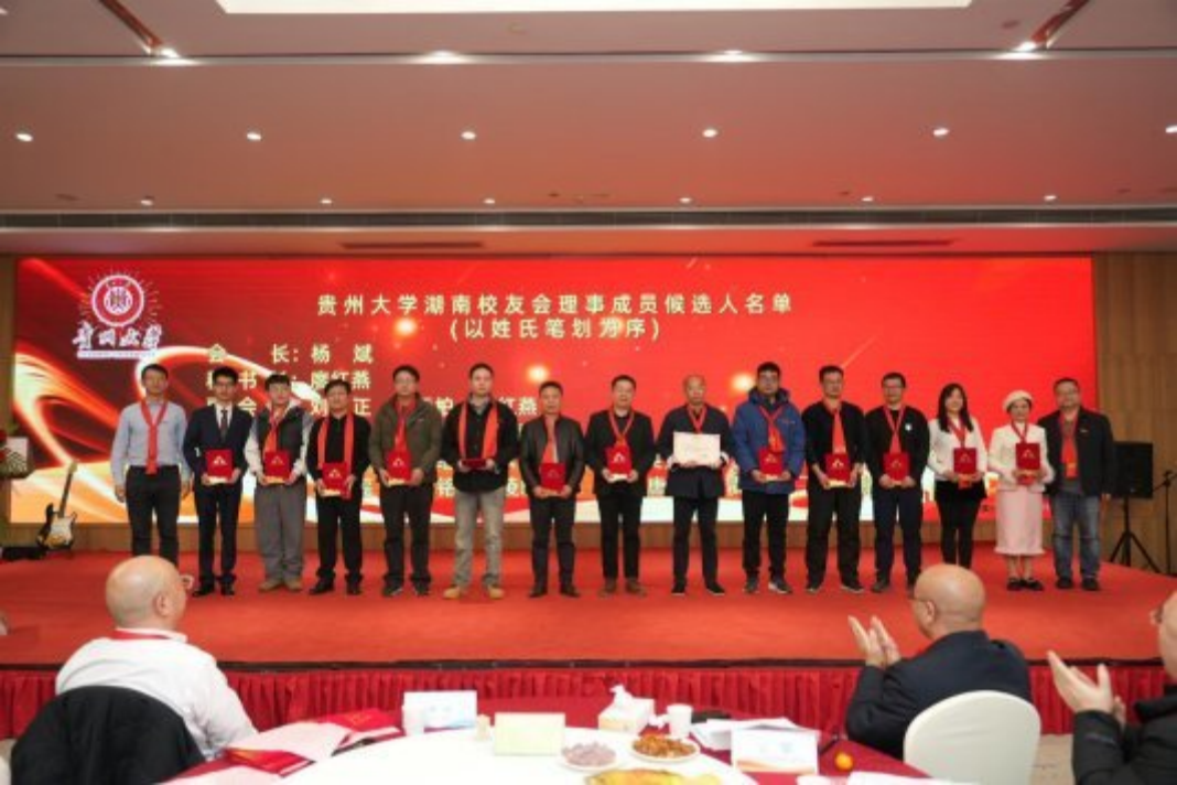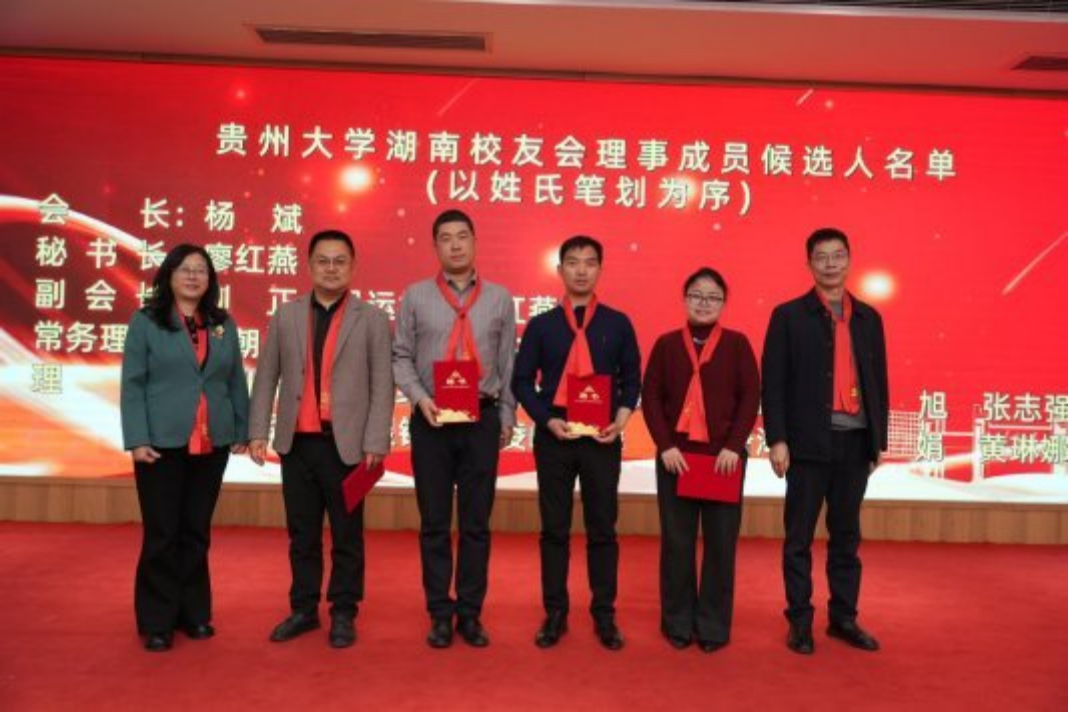 大会选举产生了贵州大学湖南校友会第一届理事会会长、副会长、秘书长、常务理事、理事。1987级硅酸盐专业校友杨斌当选为会长,2000级化学工程与工艺专业校友廖红燕当选为秘书长。吴攀、刘剑、杨静等为湖南校友会第一届理事会成员颁发聘书。