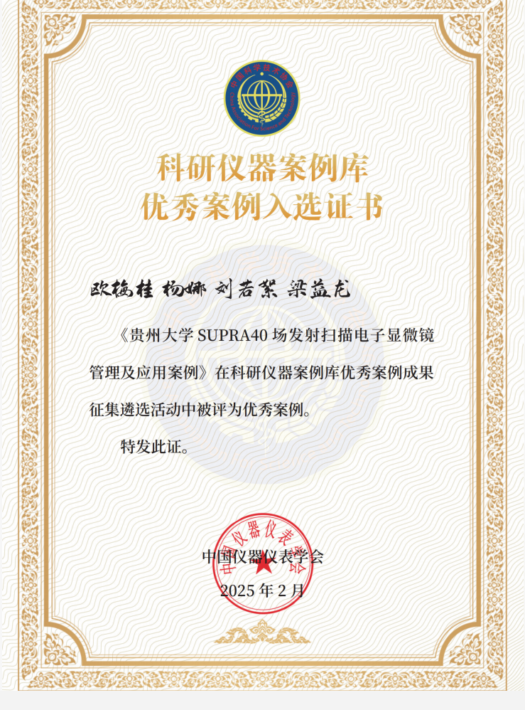 近日,中国仪器仪表学会公布了2024年度科研仪器案例成果征集遴选结果,共遴选认定100篇优秀案例。我校材料与冶金学院欧梅桂、杨娜、刘若絮和梁益龙团队《贵州大学SUPRA40场发射扫描电子显微镜管理及应用案例》入选,并被“科研仪器案例成果数据库”收录。这是我校以及贵州省相关案例首次入选。