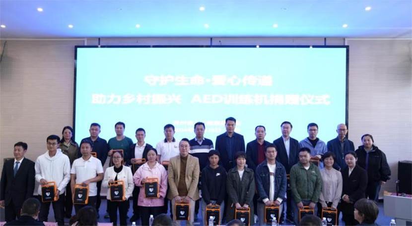 捐赠仪式环节,广州耀致电子科技公司向贵州省人口健康基金会捐赠AED训练机42台,省人口健康基金会向受赠单位代表发放AED训练机。